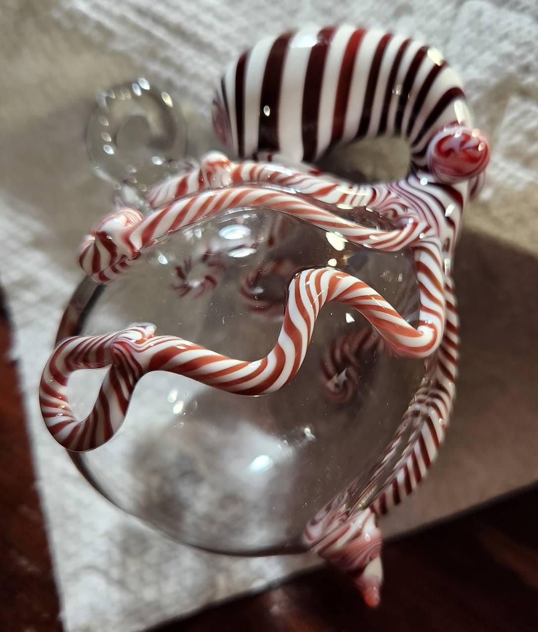 Celebrate the magic of the holidays with our exquisite hand blown glass octopus ornament, a festive collectible that brings charm and whimsy to any Christmas tree. Crafted with care from clear borosilicate glass, each piece features a delicate flamework candy cane octopus nestled inside, making it a truly unique home decor holiday accent. Perfect for those who appreciate glass blower art and want a made to order treasure that stands out year after year.