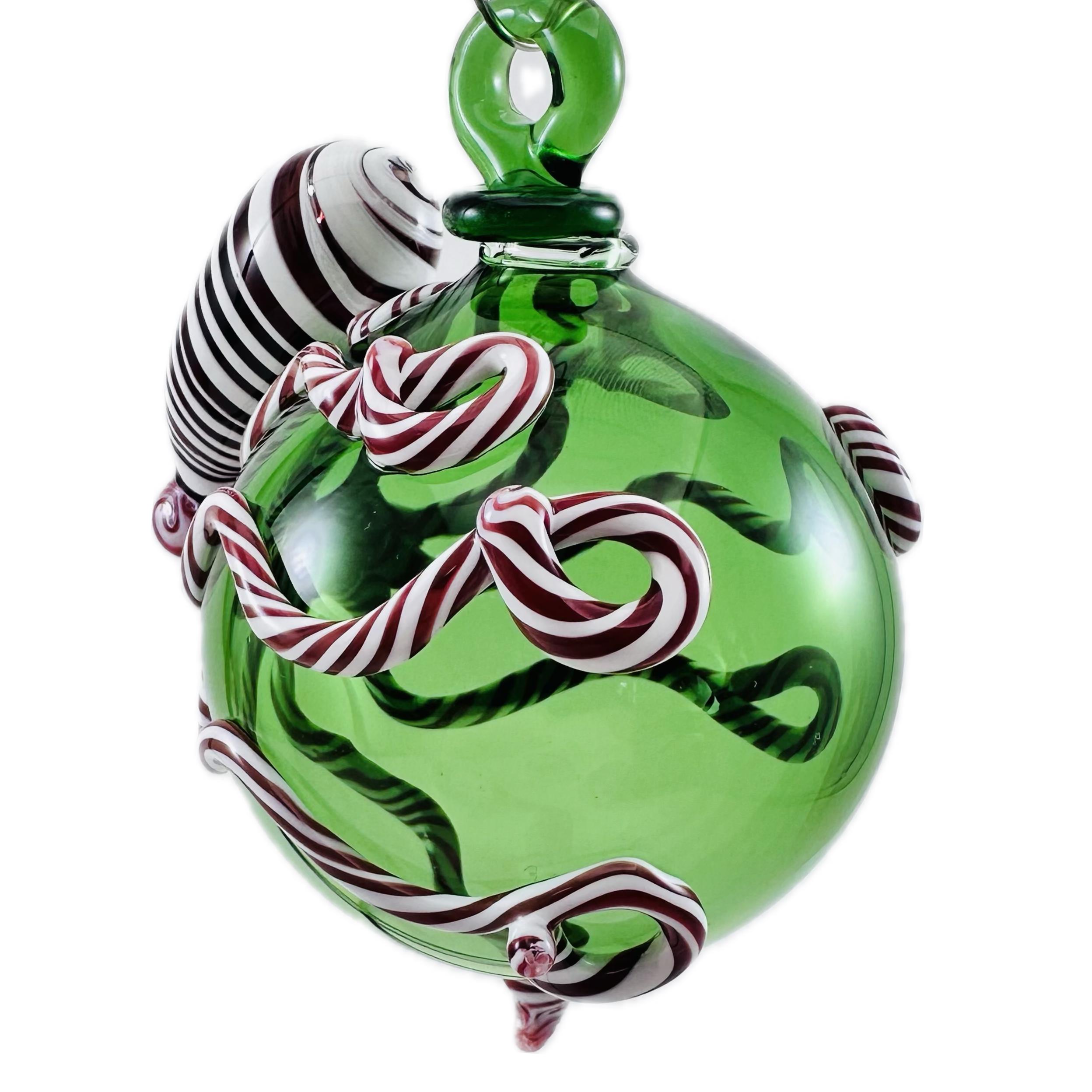 One of our best selling Octopus globe ornament is a true conversation piece! Hand blown clear globe with Flamework Candy Cane Octopus. In the drop down menu you can choose the title colors or choose your own. Made to order, created and shipped within 1-2 weeks.