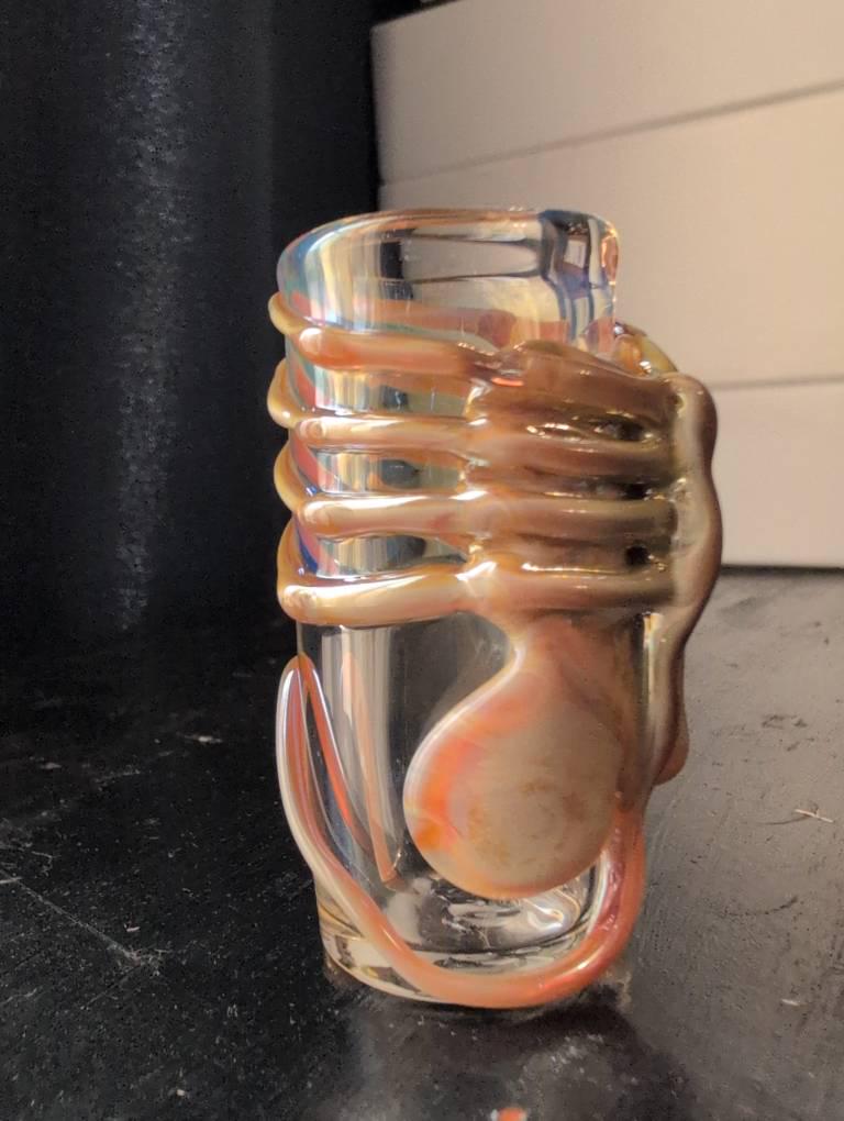 "Let me hug yo' face!" Thick wall, hand blown shot glass exquisitely detailed with a flamework Facehugger. Each glass holds 1 oz. Made to order, created and shipped within 1-2 weeks.