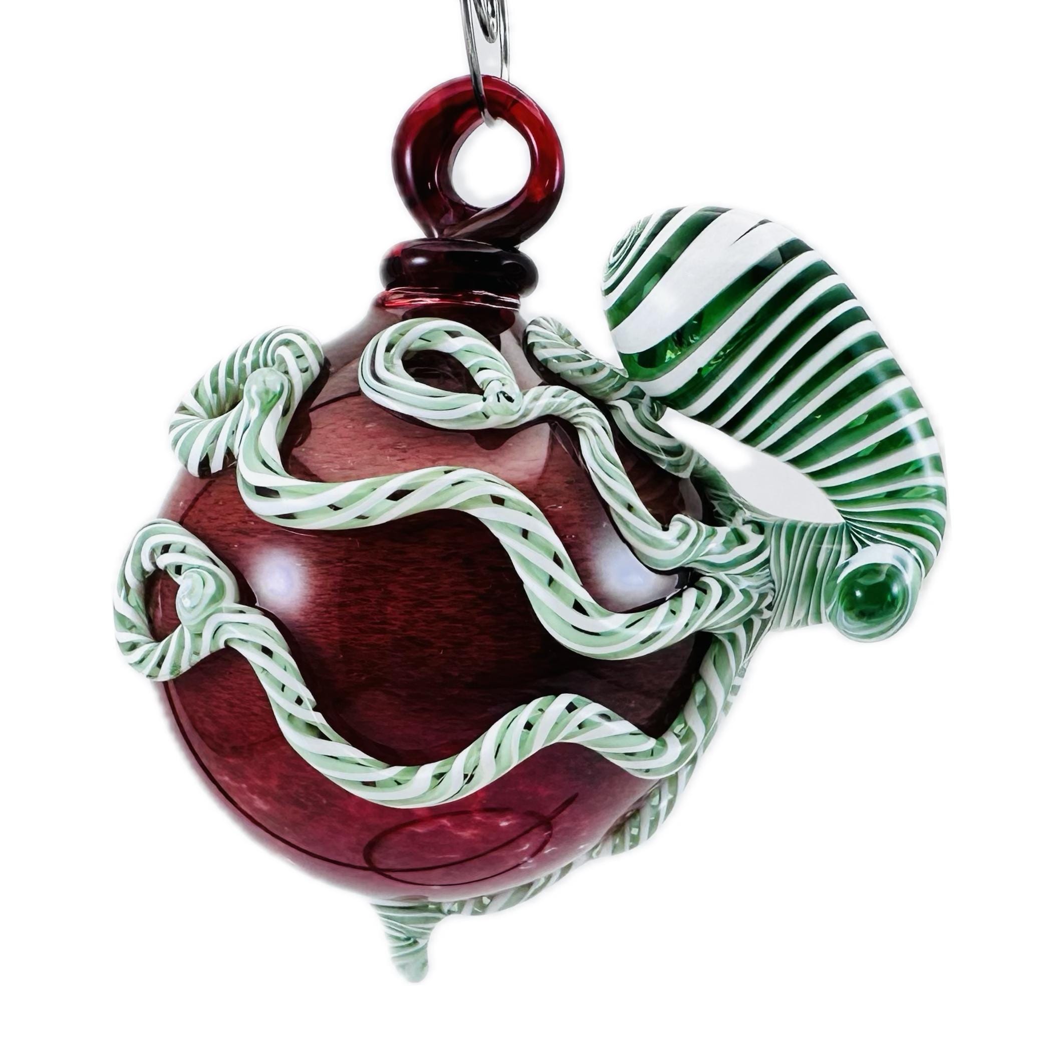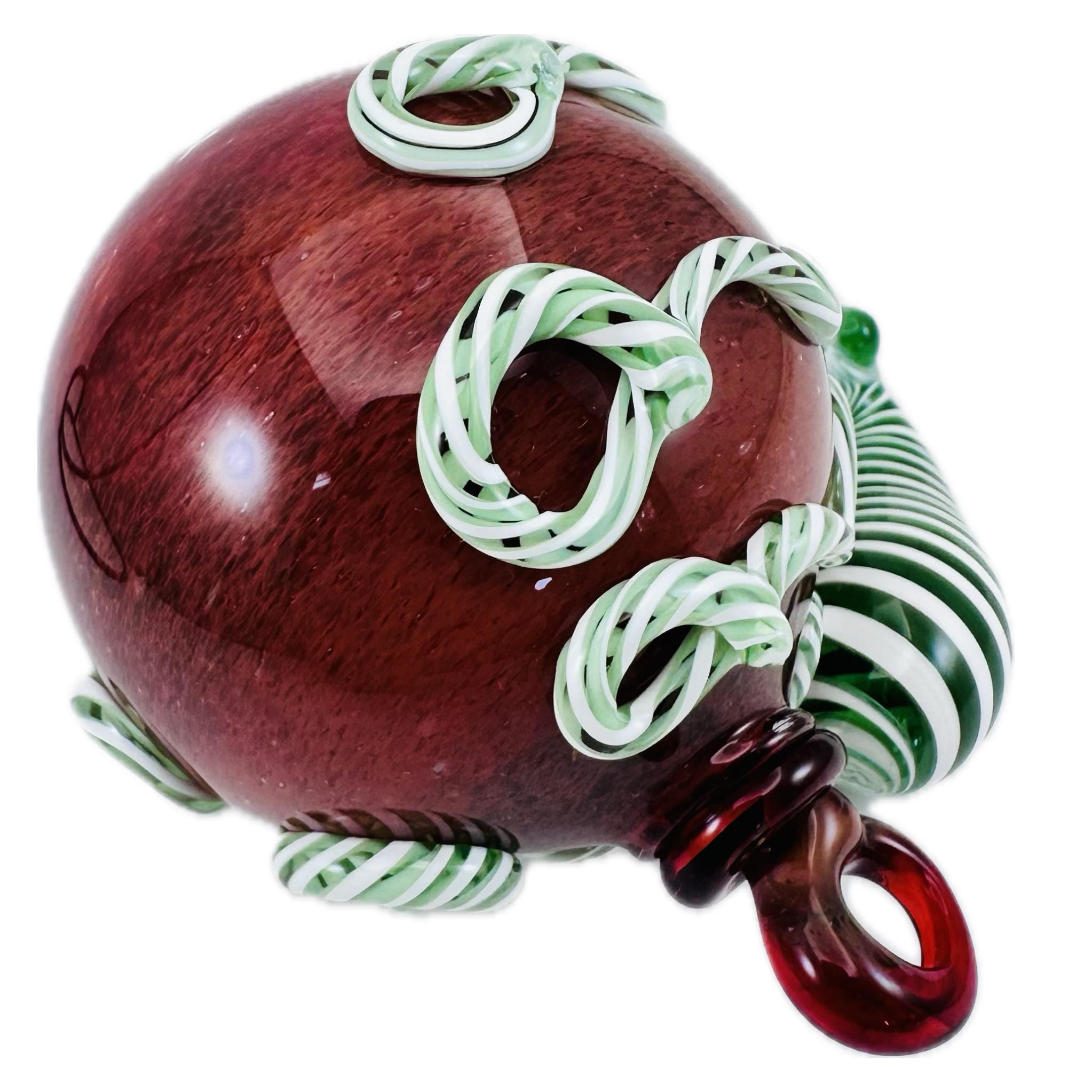 Octopus Ornament. Hand Blown Ruby Red Frit Glass with Flamework Emerald Green Candy Cane Octopi, Christmas Holiday. Custom Made to order