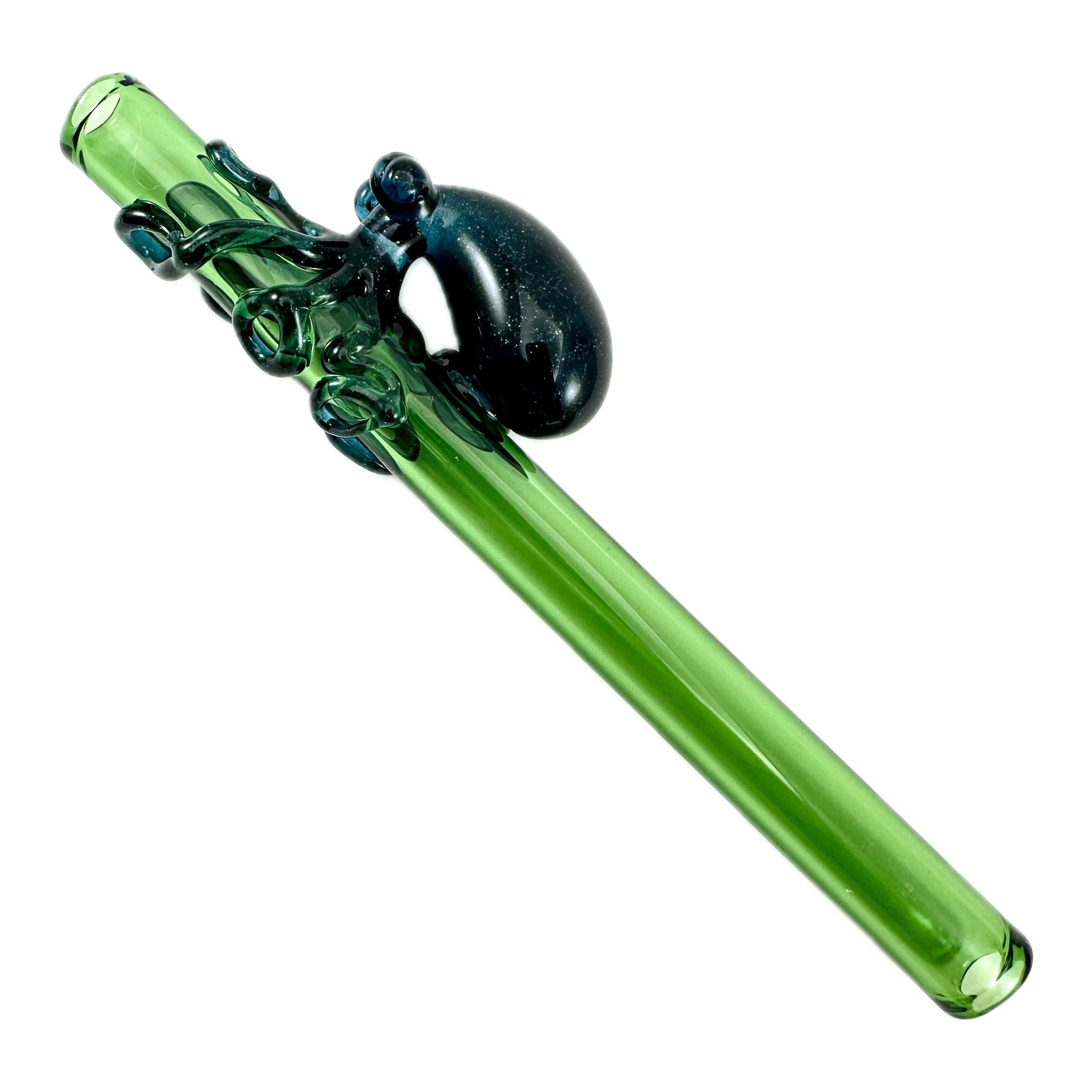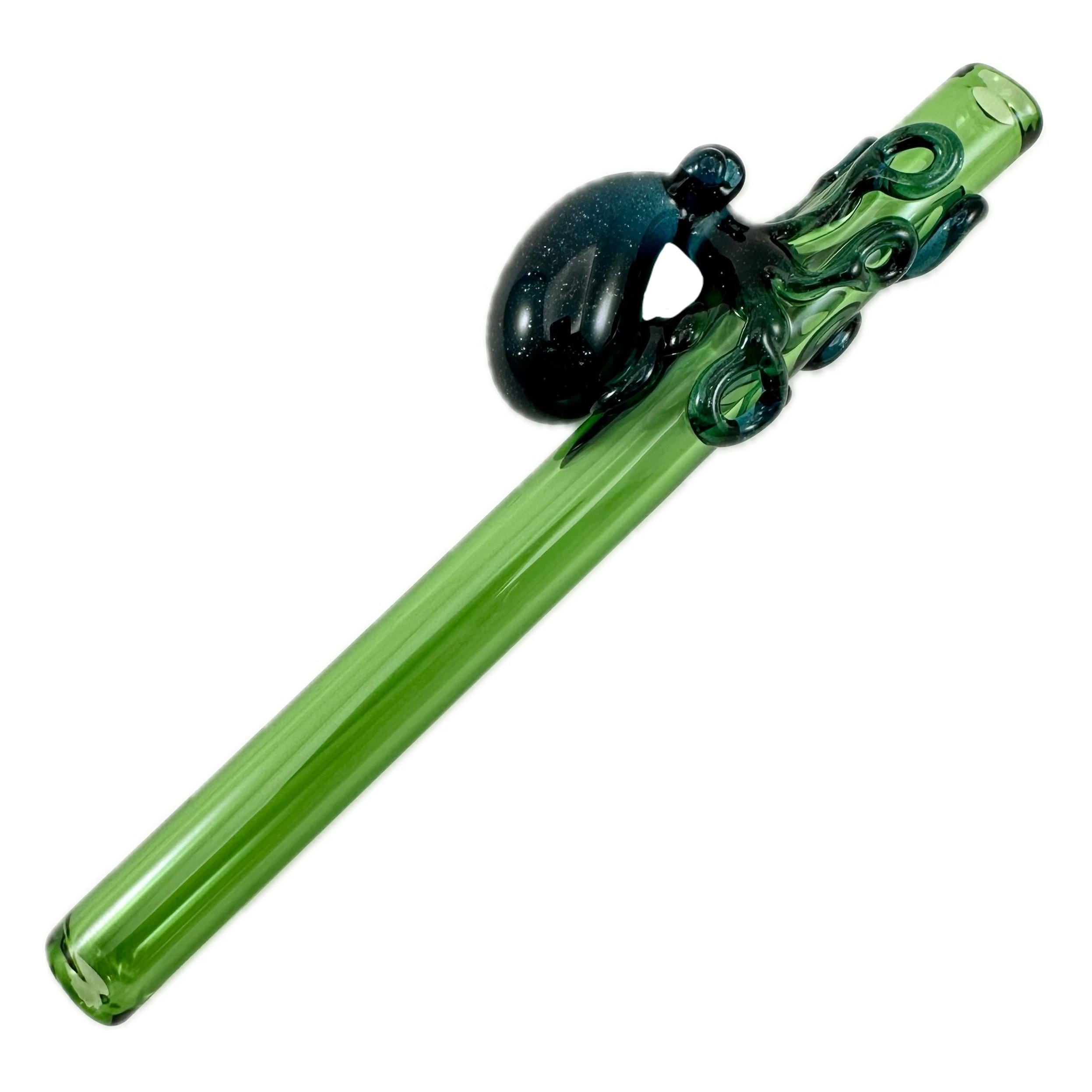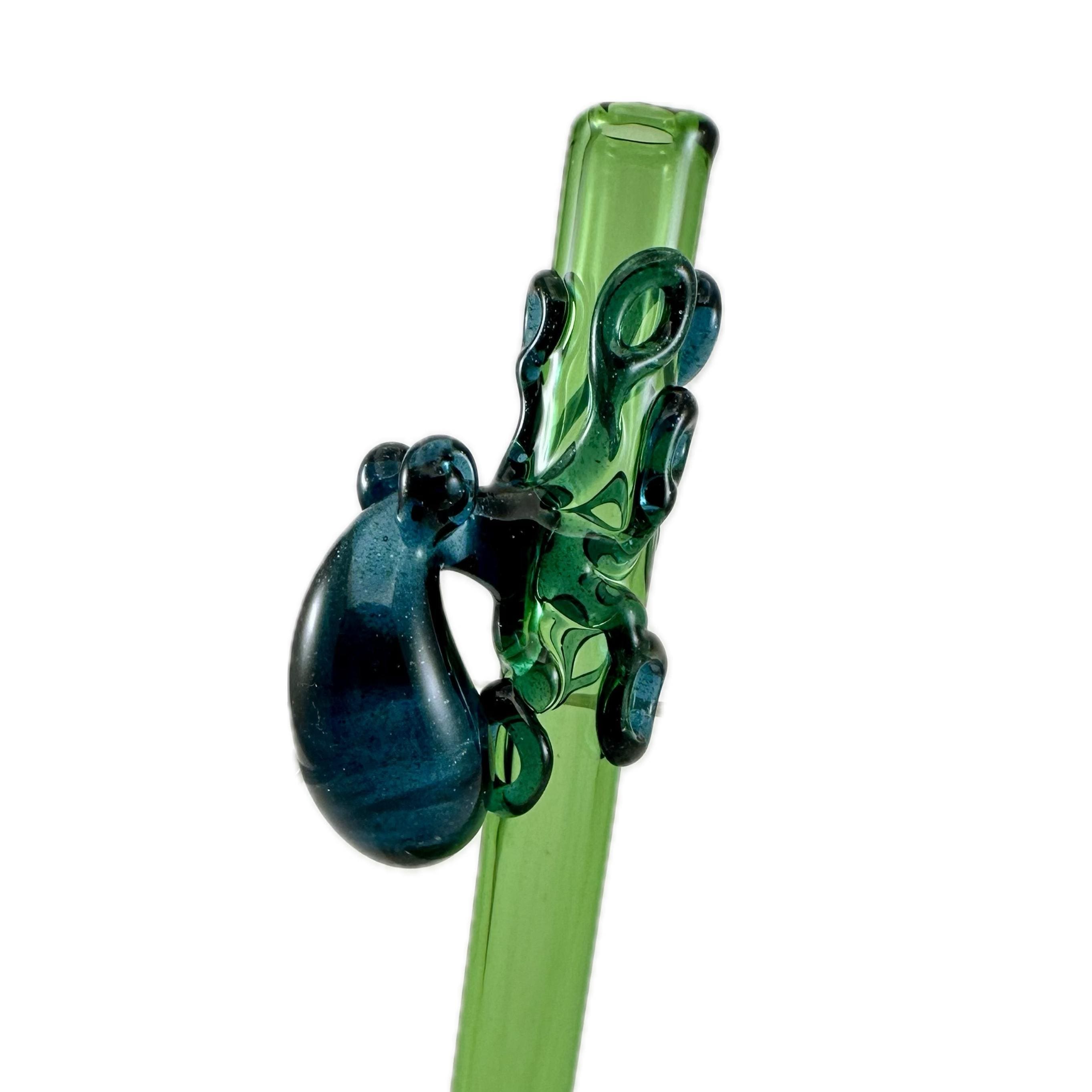 Reusable, hand-blown glass Emerald Green short wide boba or smoothie straw with a flamework blue stardust Octopus. This short straw is 5 1/2” long with 12mm width . On the drop down menu you can also choose other colors.