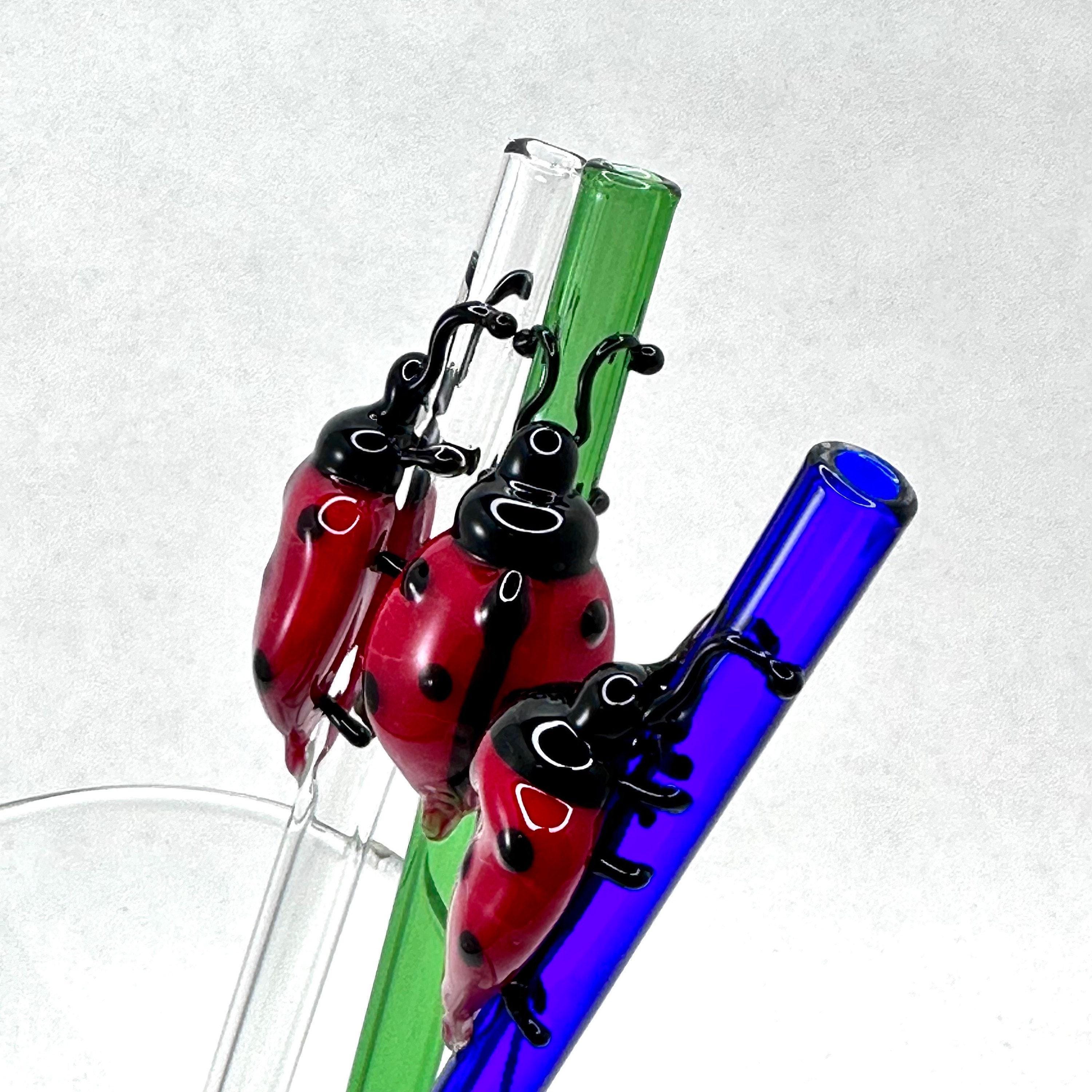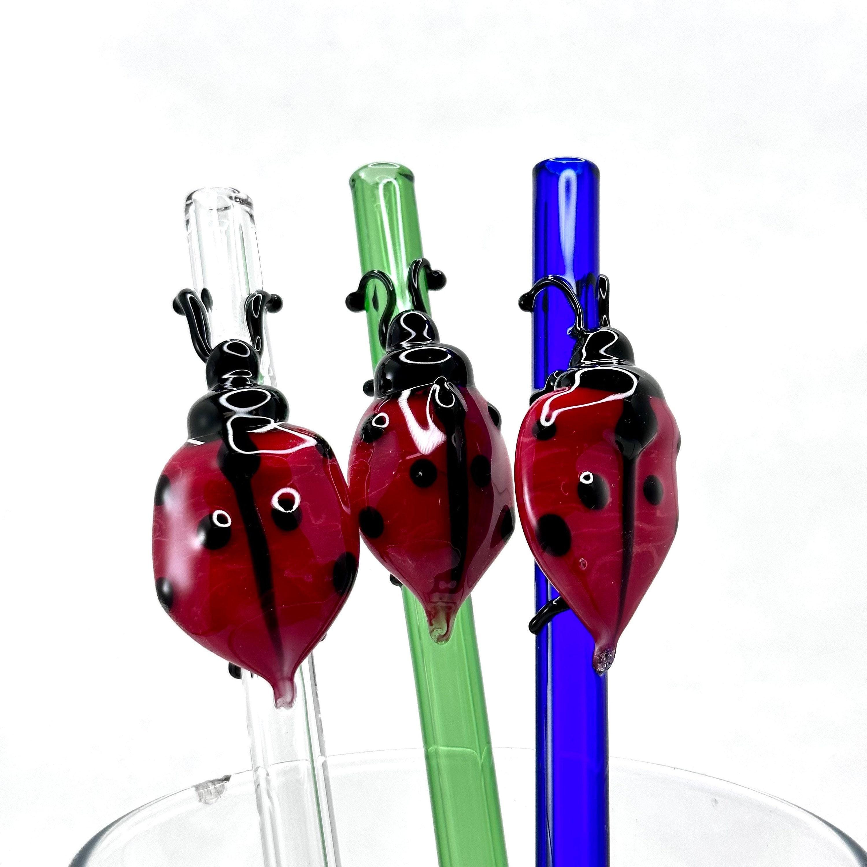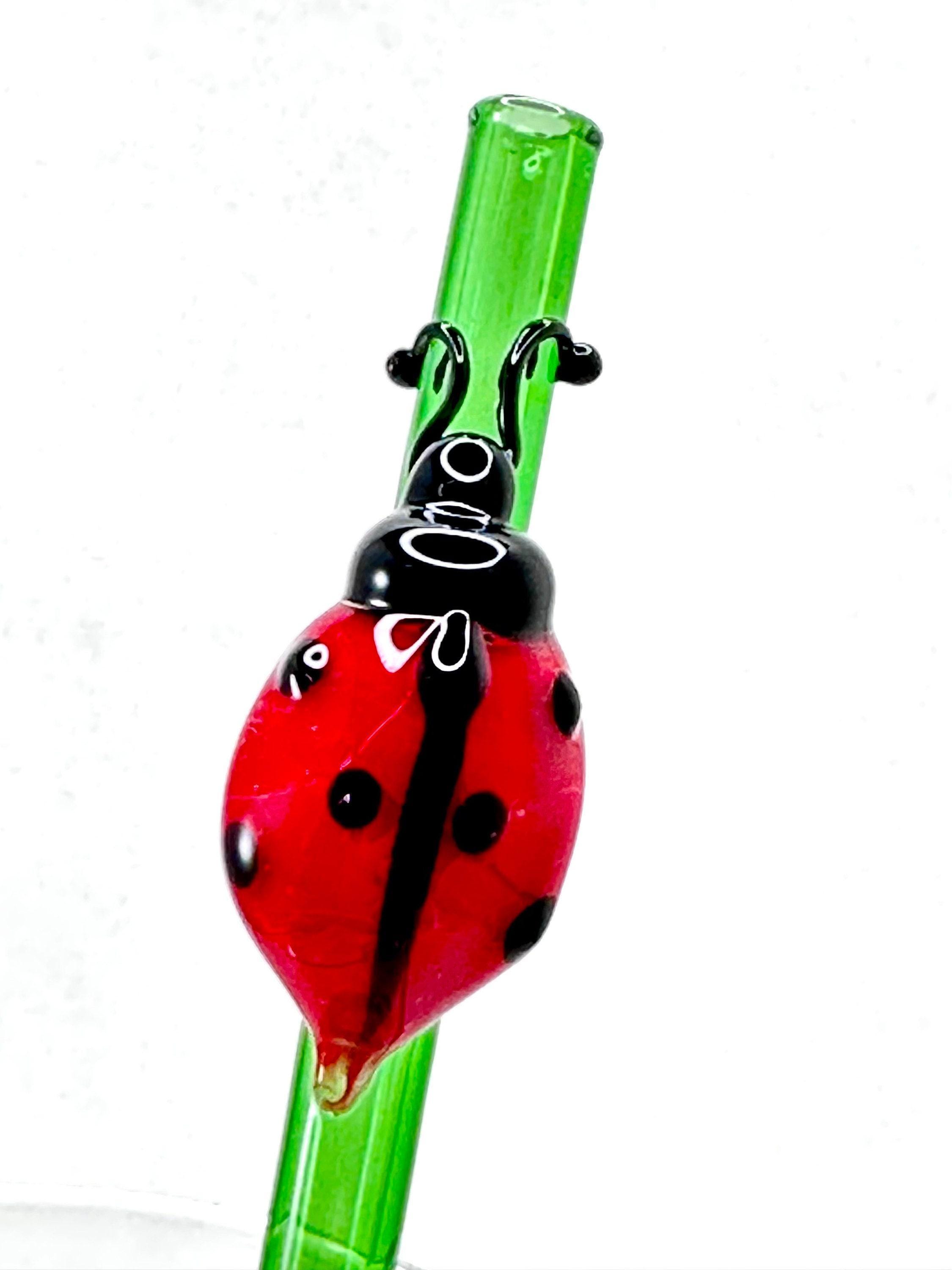 Reusable hand-blown glass straw with a flamework ladybug. Made to order, created, and shipped within 3-5 days.